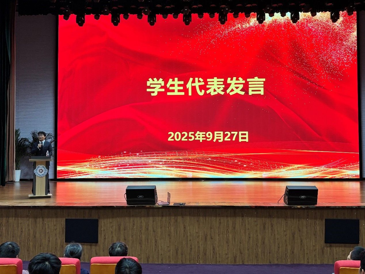 国歌唱毕,学生代表徐国庆同学结合自身成长经历,从专业学习、社团实践到生活适应等维度分享心得,以“朋辈视角”传递学院“互助共进”的育人氛围,为新生们提供了非常接地气的成长参考。