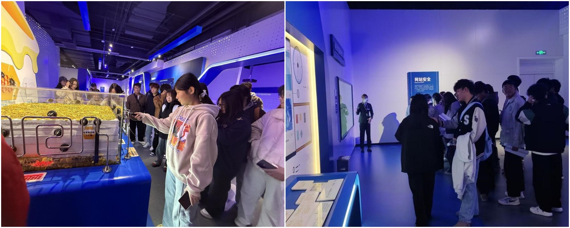 在讲解员的带领下,同学们依次参观了网络安全发展历程展区、数据安全防护展区以及前沿技术应用展区等重点区域。参观过程中,同学们专注听取讲解,并积极参加互动体验环节。在模拟黑客攻防对抗区,大家分组参与仿真防御演练,通过操作专业设备拦截恶意攻击、修复系统漏洞,在实战环境中提升了问题解决能力。同学们通过亲身体验“恶意手机充电桩”“数字卡片人”“汽车变遥控车”等贴近日常生活的网络安全场景及事例,更加清晰地感知当前我们所面临的复杂网络安全环境,更深刻地认识到网络安全对国家、社会的重要意义。