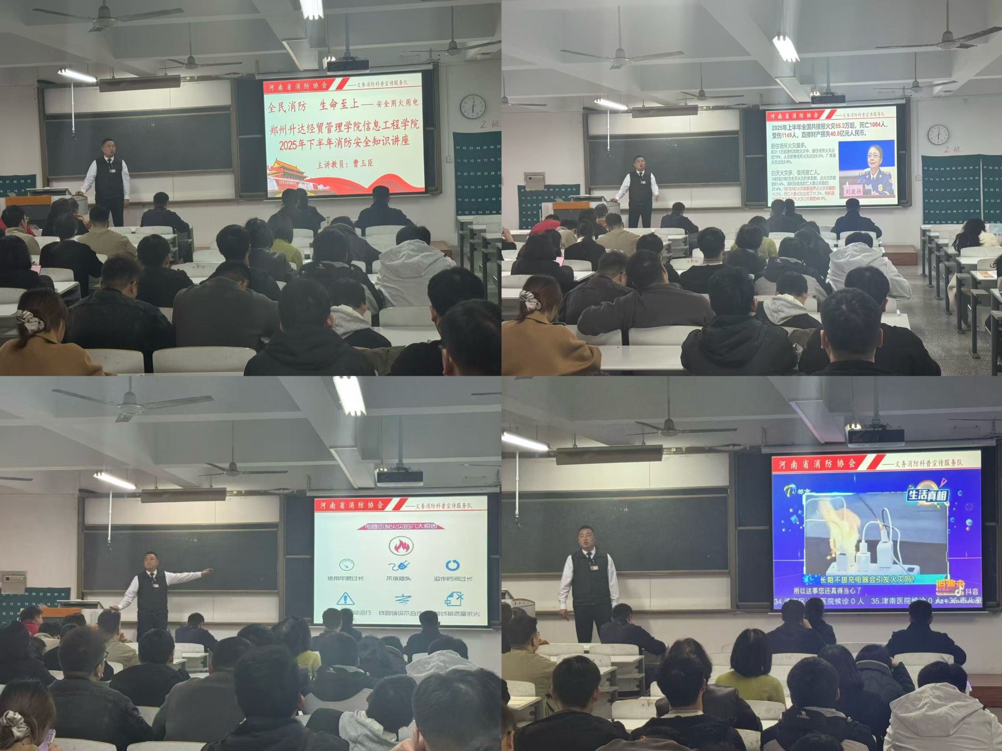 讲座伊始,曹老师通过播放火灾事故案例视频,直观展示私接电源、违规使用电器、易燃物品堆积等行为引发的安全隐患,让在所有人深刻认识到消防安全的重要性。讲座中期曹老师围绕“如何预防火灾”“火灾初期如何扑救”“火灾逃生技巧”三大核心内容展开详细讲解,他还讲解了差异化的逃生路线选择原则,提醒师生“遇火先判断、逃生不拥挤、弯腰捂口鼻,”避免因慌乱引发二次伤害。最后曹老师强调,教室、实验室和宿舍是学生在校生活的核心区域,也是火灾隐患的高发地,不仅要做到卫生整洁,更要守住安全红线。