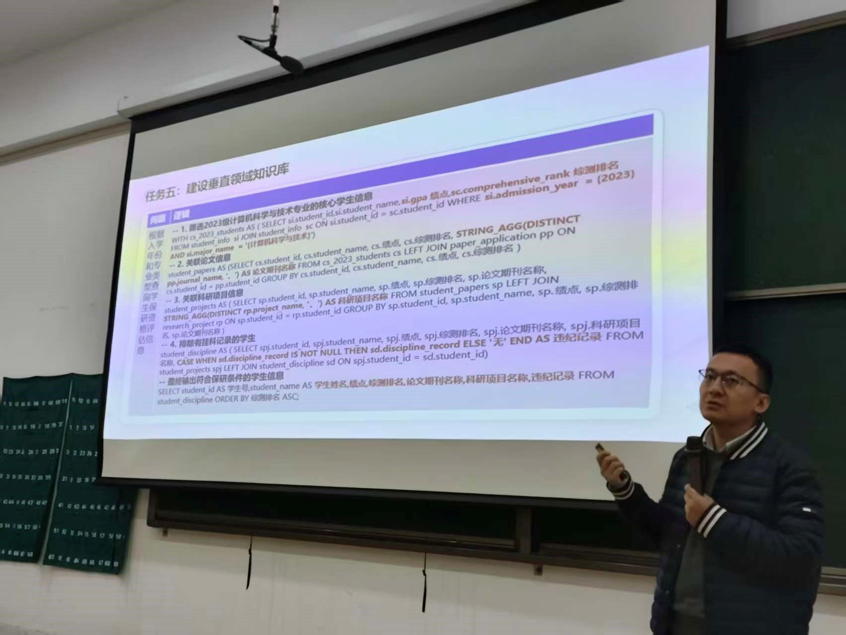 王永博士首先梳理了传统高校管理系统中的痛点问题,如跨系统数据查询需切换多平台、辅导员手动汇总保研资格信息易出错且重复劳动多、业务办理入口分散、学生申请奖学金需经4-5级导航等,随后提出突破性方案:利用校园智能助手借Text2SQL技术实现自然语言查数,师生无需专业技能即可获取个性化数据;智能导航直达功能让 “申请秋季奖学金” 等操作一步跳转,大幅简化流程。该方案的技术闭环尤为亮眼:从网页采集、实体关系提取,到AI自动匹配18项规则清洗数据、补全元数据、构建垂直领域知识库,系统能精准理解“有效选课”、“保研资格评估” 等专业术语,同时结合同义实体匹配提升语义理解准确性。再运用Chat Agent(靠多轮对话记忆、歧义澄清解决自然语言模糊性)与SQL Agent(凭实体抽取、智能SQL生成攻克数据库查询难题)两大智能体,成为核心支撑,真正实现 “数据多跑路,师生少跑腿”。
