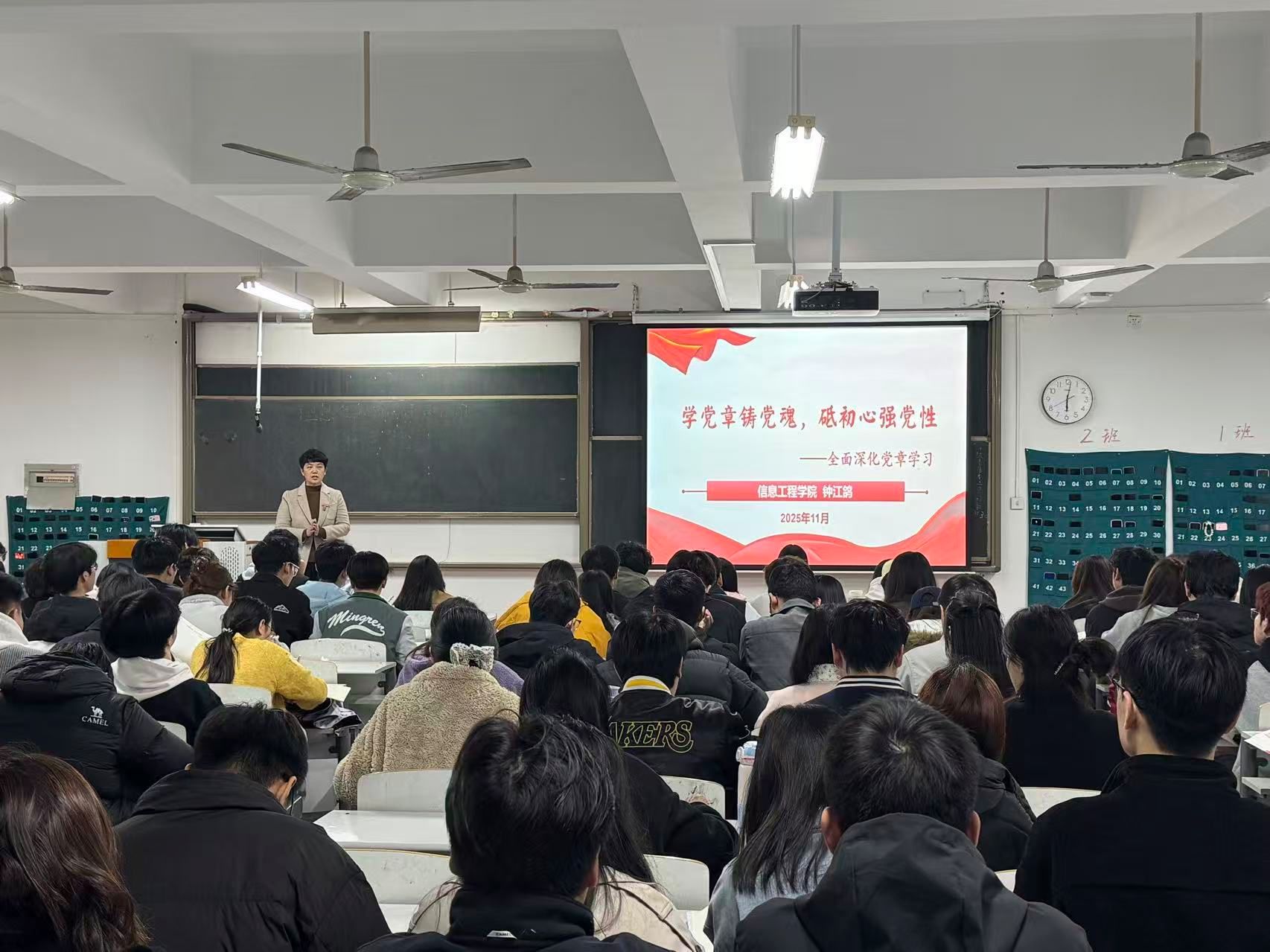 2025年11月6日中午,太阳成集团tyc122cc党委书记钟江鸽在资讯楼213教室,以《学党章铸党魂,砥初心强党性——全面深化党章学习》为题,为第二十二期入党积极分子和发展对象讲授专题党课,旨在引导学员深化党章理解、筑牢信仰之基。