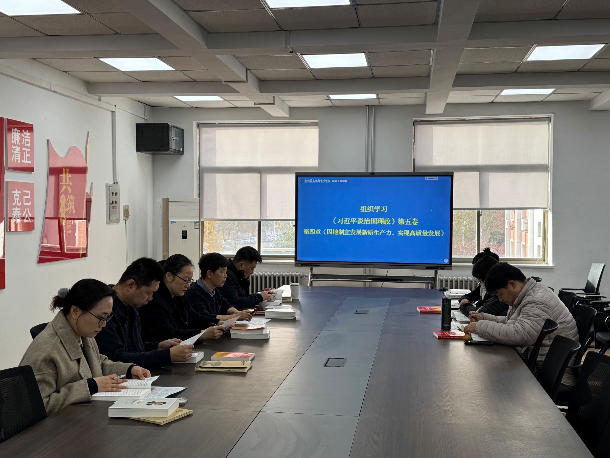 会上,全体成员紧扣学习主题开展集中研学,重点学习两项核心内容:一是专题学习《习近平谈治国理政》第五卷第四章《因地制宜发展新质生产力,实现高质量发展》,由齐雷同志领学《当前经济工作的几个重大问题》,杨亚丽同志领学《加快构建新发展格局,把握未来发展主动权》,钟江鸽同志领学《发展新质生产力是推动高质量发展的内在要求和重要着力点》与《经济工作必须统筹好几对重要关系》,通过分章节领学、集体研讨的方式,深刻领会新质生产力的核心要义、实践路径,以及经济工作中需把握的辩证关系;二是系统学习习近平总书记关于《中共中央关于制定国民经济和社会发展第十五个五年规划的建议》的说明,深入理解“十五五”规划立足教育强国、科技强国、人才强国建设的战略考量,准确把握“加快高水平科技自立自强,引领发展新质生产力”的重大部署。